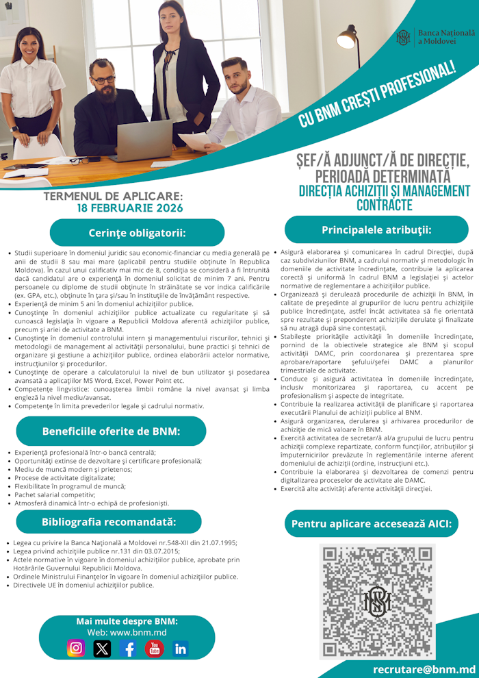 Șef/ă adjunct/ă de direcție, pe perioadă determinată, în cadrul Direcției Achiziții și Management Contracte