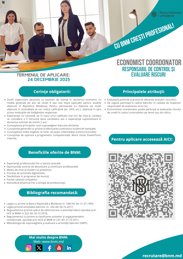 Economist principal, responsabil de reglementarea prudențială a entităților din sectorul asigurărilor/reasigurărilor