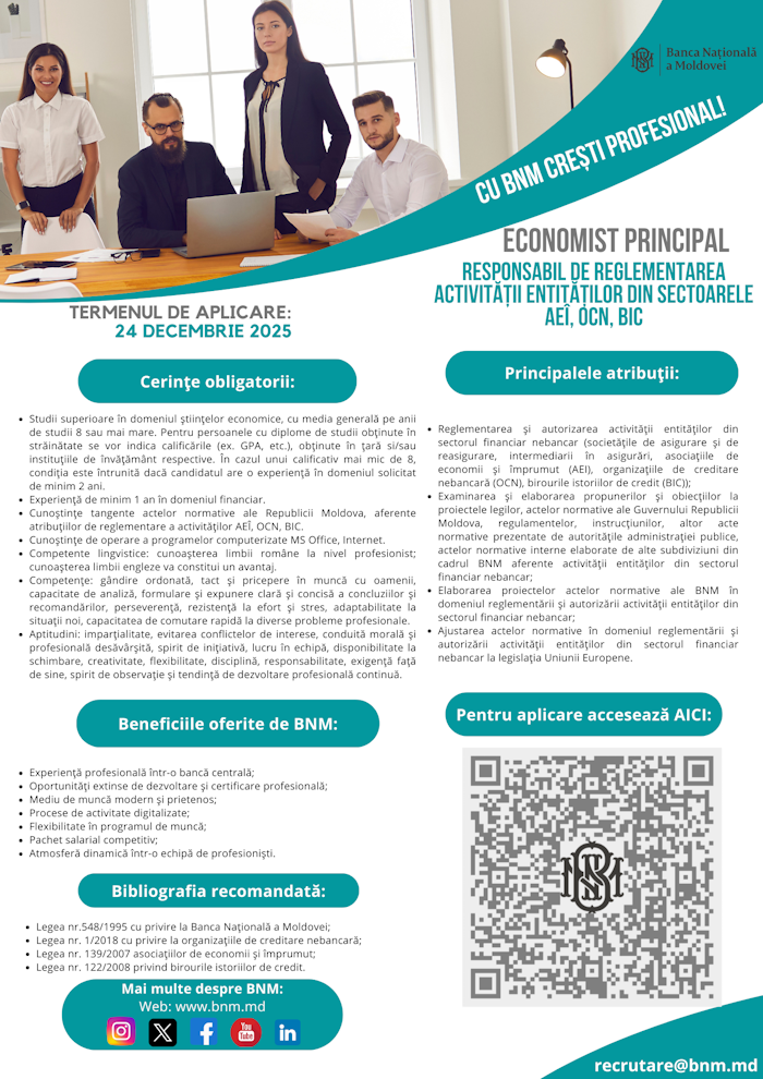 Economist principal responsabil de reglementarea activității entităților din sectoarele AEÎ, OCN, BIC