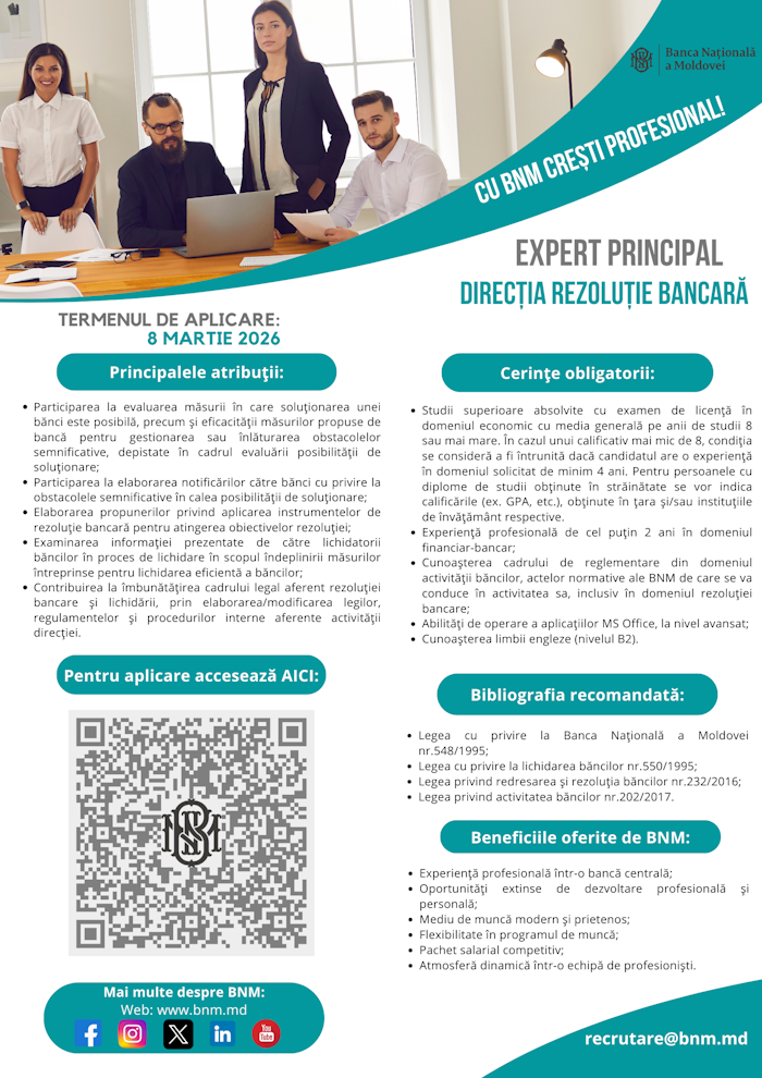 Expert(ă) principal(ă) al/a Secției Rezoluție bancară al/a Direcției Rezoluție bancară